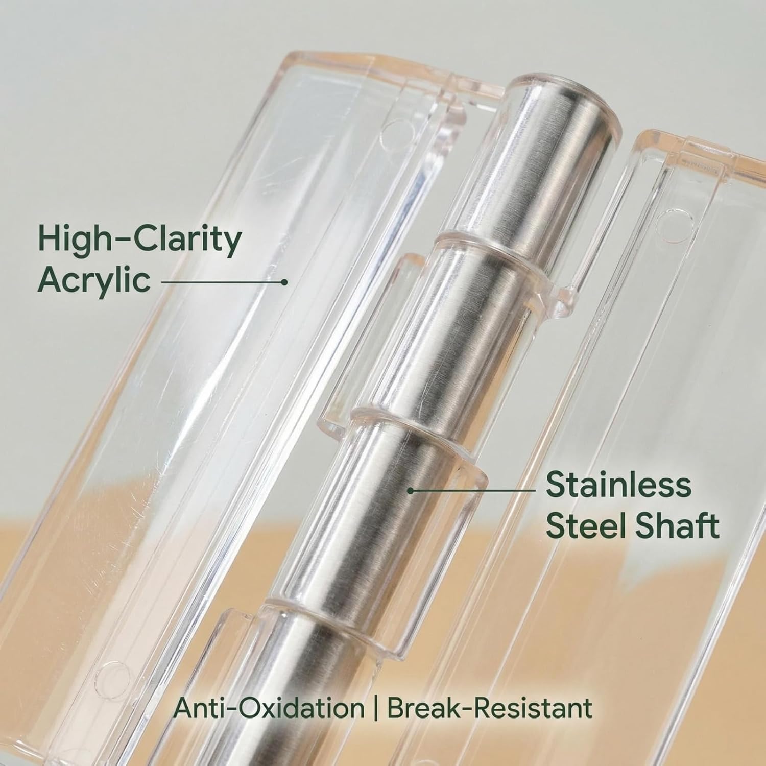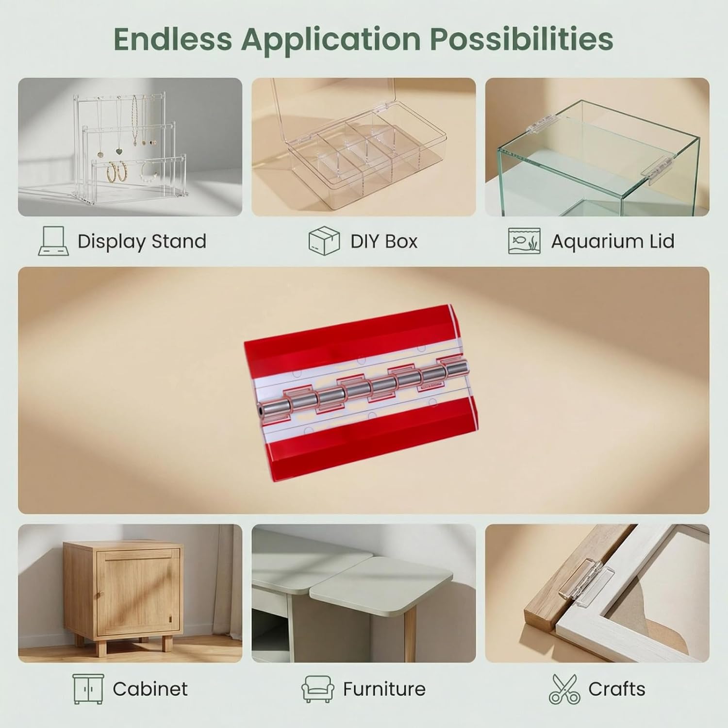 Give your projects a clean, professional finish with LIZIFEQZ Clear Acrylic Hinges. Designed for those who demand both style and simplicity, these self-adhesive hinges eliminate the need for drilling while providing a nearly invisible, sleek appearance. Crafted from high-quality acrylic, each hinge is virtually transparent, blending seamlessly with glass, acrylic, and clear plastic surfaces. The polished finish resists yellowing and clouding, maintaining its crystal-clear look for years. The integrated stainless steel shaft ensures smooth, quiet operation without rust or corrosion, even in humid environments like aquariums or bathrooms. Installation couldn’t be easier. The powerful 3M self-adhesive backing bonds instantly to clean, smooth surfaces—simply peel off the protective film, position the hinge, and press firmly. No tools, no drilling, no messy glue. The adhesive is strong enough for permanent applications yet can be removed cleanly if repositioning is needed. These versatile hinges are perfect for countless applications: Aquariums & Terrariums: Secure lids for easy feeding and maintenance Display Cases: Create elegant showcases for collectibles, memorabilia, or retail items DIY Boxes: Build custom jewelry boxes, gift boxes, or storage containers Glass Cabinets: Add hidden hinges to glass-door cabinets for a modern look Craft Projects: Ideal for dollhouses, shadow boxes, and model displays Each pack includes 6 hinges, giving you plenty for multiple projects or replacements.