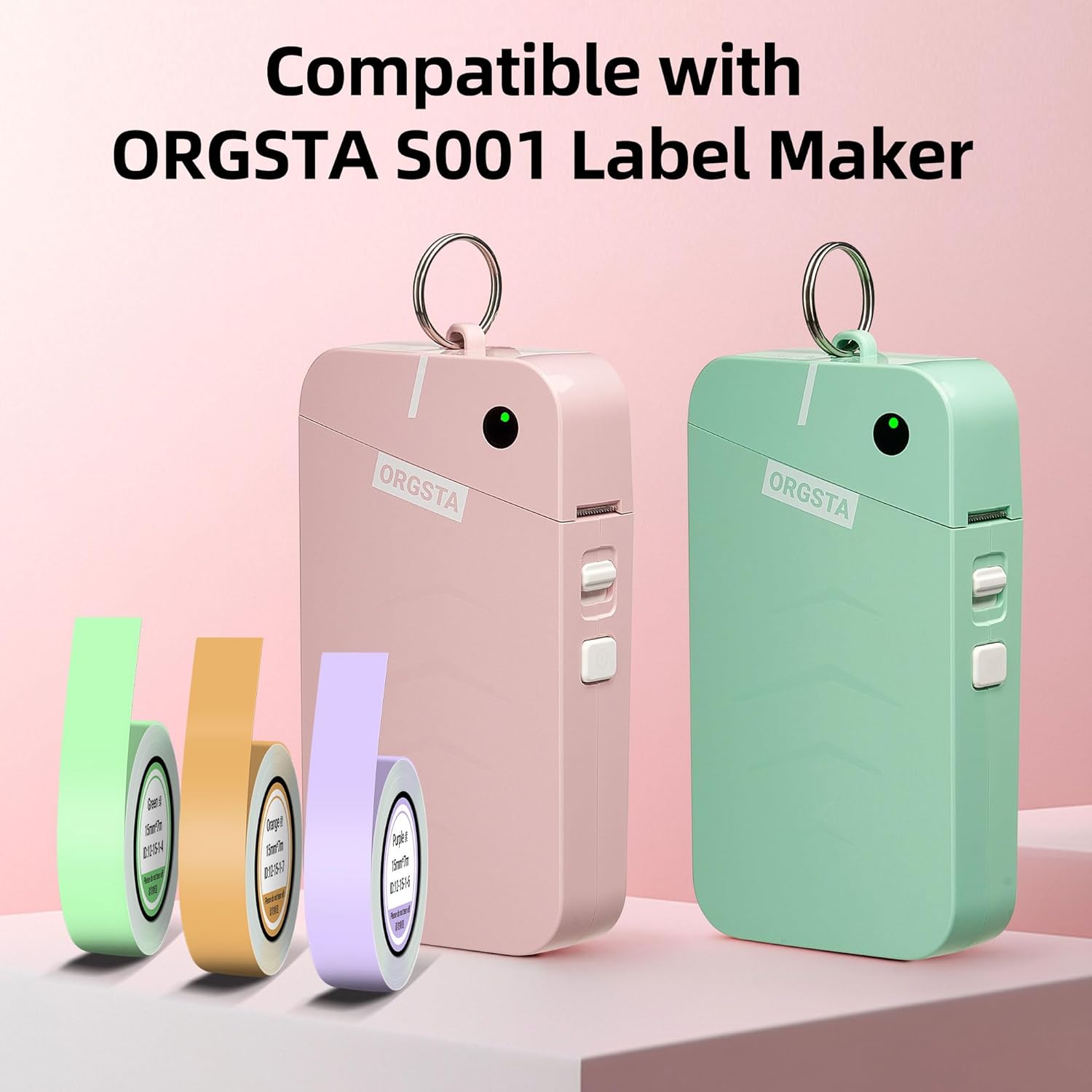 ORGSTA S001 Label Maker with with Tape, Bluetooth Label Maker with 3 Roll 0.59"×22.97' (15mm×7m) Thermal Continuous Label Tape S001 Label Maker: Color: Pink Resolution: 203DPI Maximum print speed: 35 inches per minute (15 mm/s) Label Tapes: Style: Continuous label tape Color: Purple/Green/Orange Size: 0.59 inchs × 22.97 feet Pack: 3 Roll
