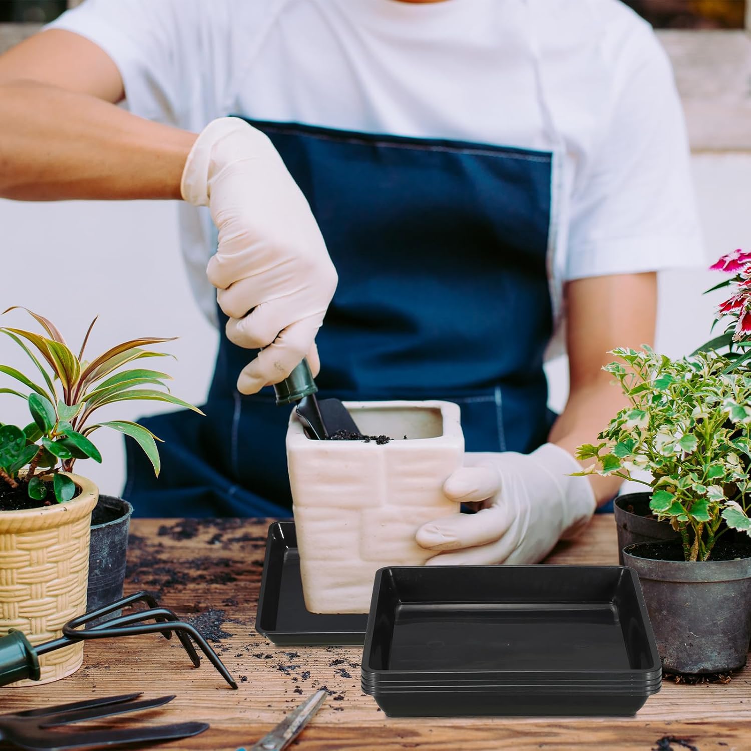 Plant saucers serve as shallow dishes designed to collect any excess water that drains from container plants. They can also be utilized for displaying, storing, and organizing various items.SpecificationInner Size: 19.5 x 19.5 x 3.1 cm / 7.7 x 7.7 x 1.2 inch (L*W*H); Overall Size: 22 x 22 cm / 9 x 9 inch (L*W); Package Content: 10 x Square Plant Pot SaucersAdvantageCrafted from plastic, lightweight yet durable, water retention and resistance to breakage. With their innovative and stylish design, they provide a practical solution for preventing water drainage and soil spillage. By keeping your plants and surrounding areas clean and tidy, they offer convenience and ease of maintenance. Additionally, the vibrant color of these saucers adds a touch of Nordic minimalist to your home, office, patio, garden, and more.InstructionTo ensure proper drainage and protect the roots from sitting in excessive water, it is important to empty the saucers within 30-60 minutes after each watering.AttentionWe recommend measuring the diameter of the top of the plant container and selecting a saucer that matches or slightly exceeds this diameter.